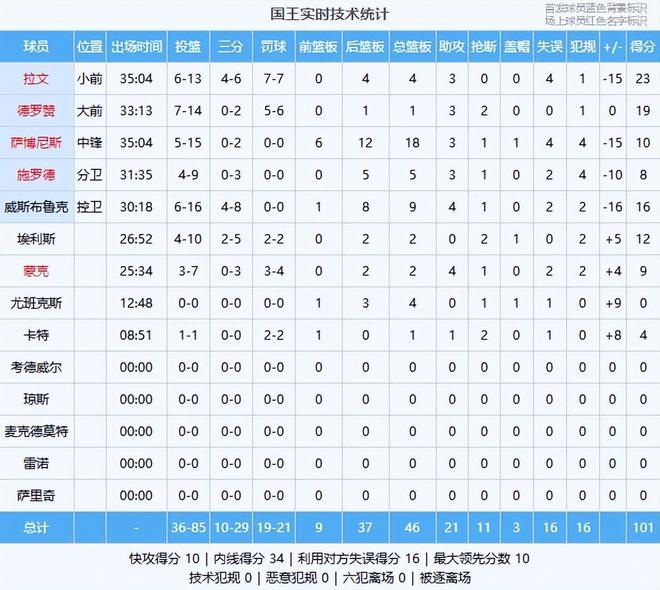二号罪人(拉文):全场13中6的23分4篮板3助攻,正负值-15,国王被逆转的主要原因就是出现在最后2分钟,而这段时间拉文的发挥堪称灾难,防守不卡人让雷霆连续抢到前场篮板,最终输球!